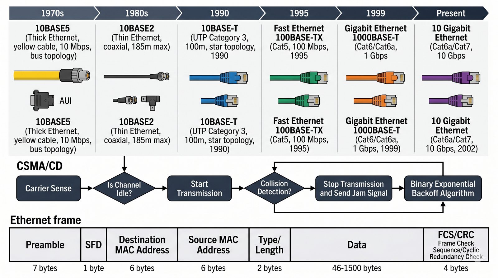 W1 Narodziny Ethernetu, Xerox PARC, standardy 10BASE5 i 10BASE2, ewolucja okablowania i przepustowości.