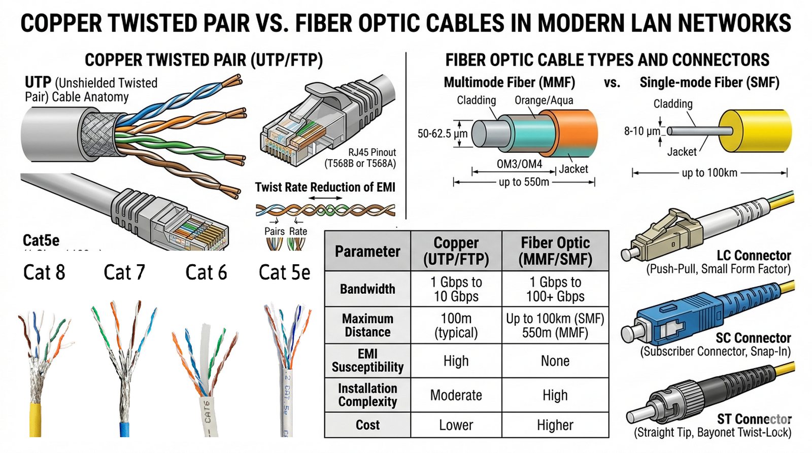 W2 Okablowanie strukturalne, skrętka UTP/STP, kategorie kabli, światłowody jednomodowe i wielomodowe, zjawisko tłumienia sygnału.