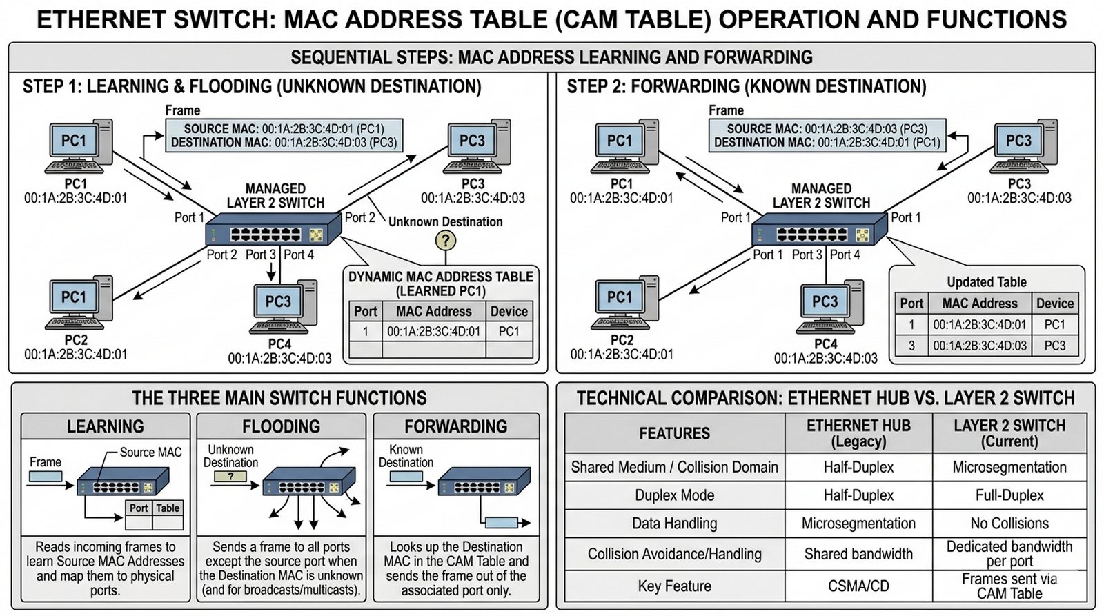 W3 Budowa i działanie przełącznika (Switch), tablica adresów MAC, proces uczenia się, flooding, filtrowanie i przesyłanie ramek.
