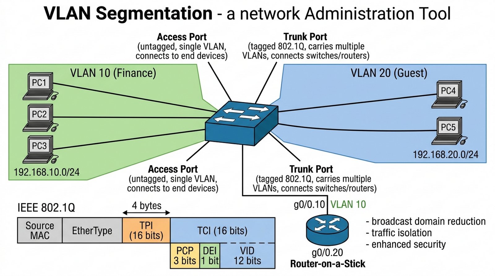 W3 W4 Sieci wirtualne VLAN, tagowanie 802.1Q, porty Access i Trunk, routing między VLAN-ami, korzyści bezpieczeństwa.