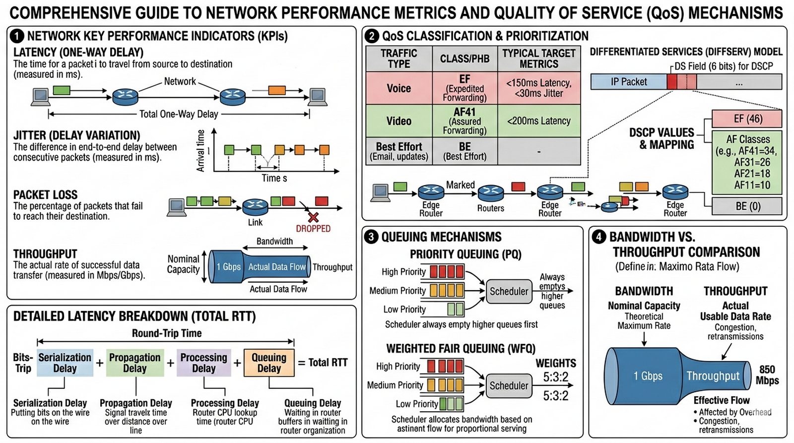 Student wyjaśnia pojęcia związane z jakością i wydajnością pracy sieci komputerowej, takie jak opóźnienie (latencja), jitter oraz utrata pakietów (packet loss). Opisuje różnicę między przepustowością nominalną (bandwidth) a faktycznym transferem danych (throughput), oraz identyfikuje przyczyny powstawania wąskich gardeł w infrastrukturze sieciowej. Szczególną uwagę poświęca mechanizmom Quality of Service (QoS), które umożliwiają priorytetyzację ruchu sieciowego i zapewniają płynność działania usług wrażliwych na opóźnienia, takich jak VoIP czy wideokonferencje.