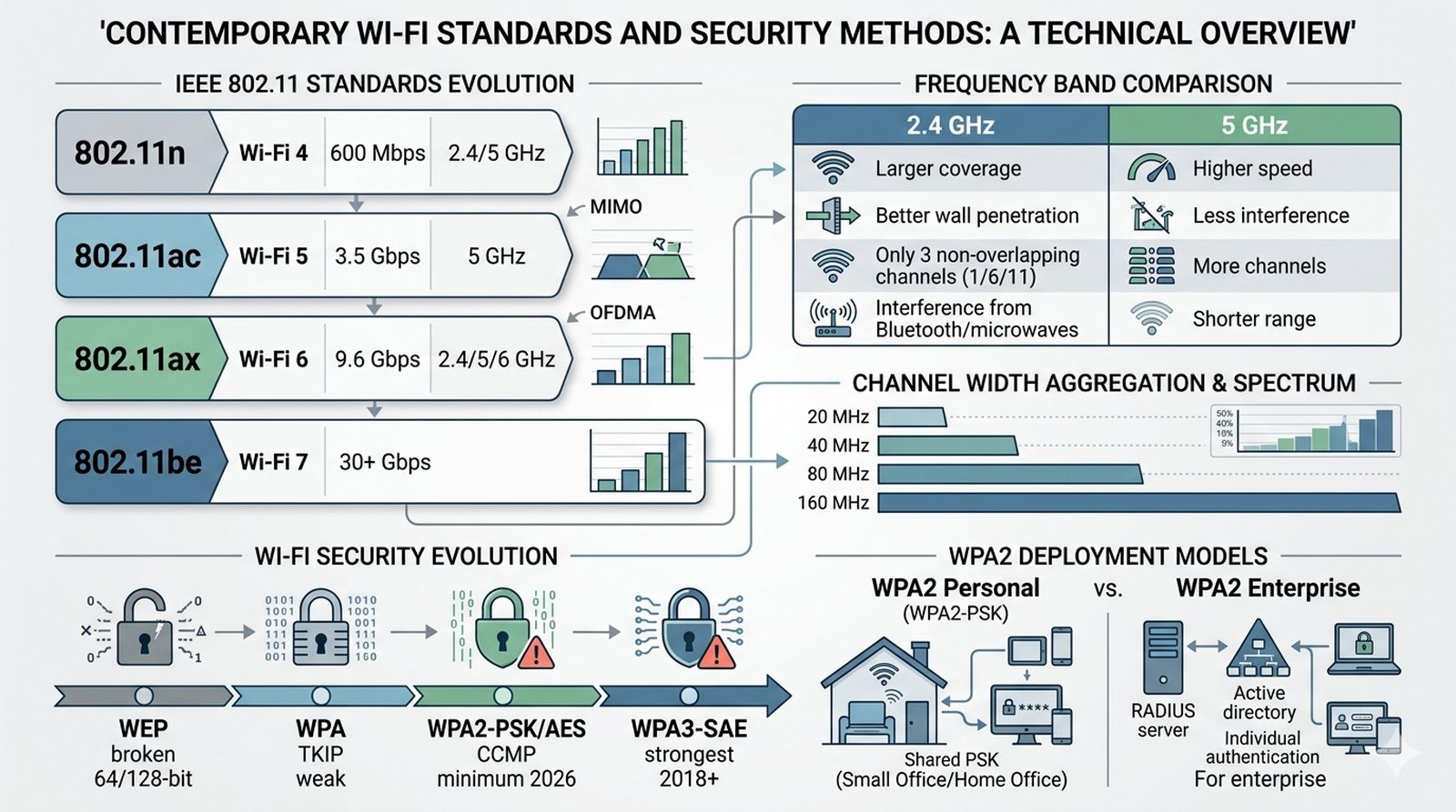 Student opisuje współczesne standardy komunikacji bezprzewodowej Wi-Fi, ze szczególnym uwzględnieniem ewolucji od 802.11n przez 802.11ac do najnowszego 802.11ax (Wi-Fi 6). Wyjaśnia różnice między pasmami częstotliwości 2,4 GHz i 5 GHz pod względem zasięgu, przenikalności przez ściany i podatności na interferencje. Omawia metody zabezpieczania sieci bezprzewodowych — od przestarzałego WEP, przez WPA2, po najbezpieczniejszy standard WPA3 — oraz różnice między uwierzytelnianiem personalnym (PSK) a korporacyjnym (Enterprise) z wykorzystaniem serwera RADIUS.