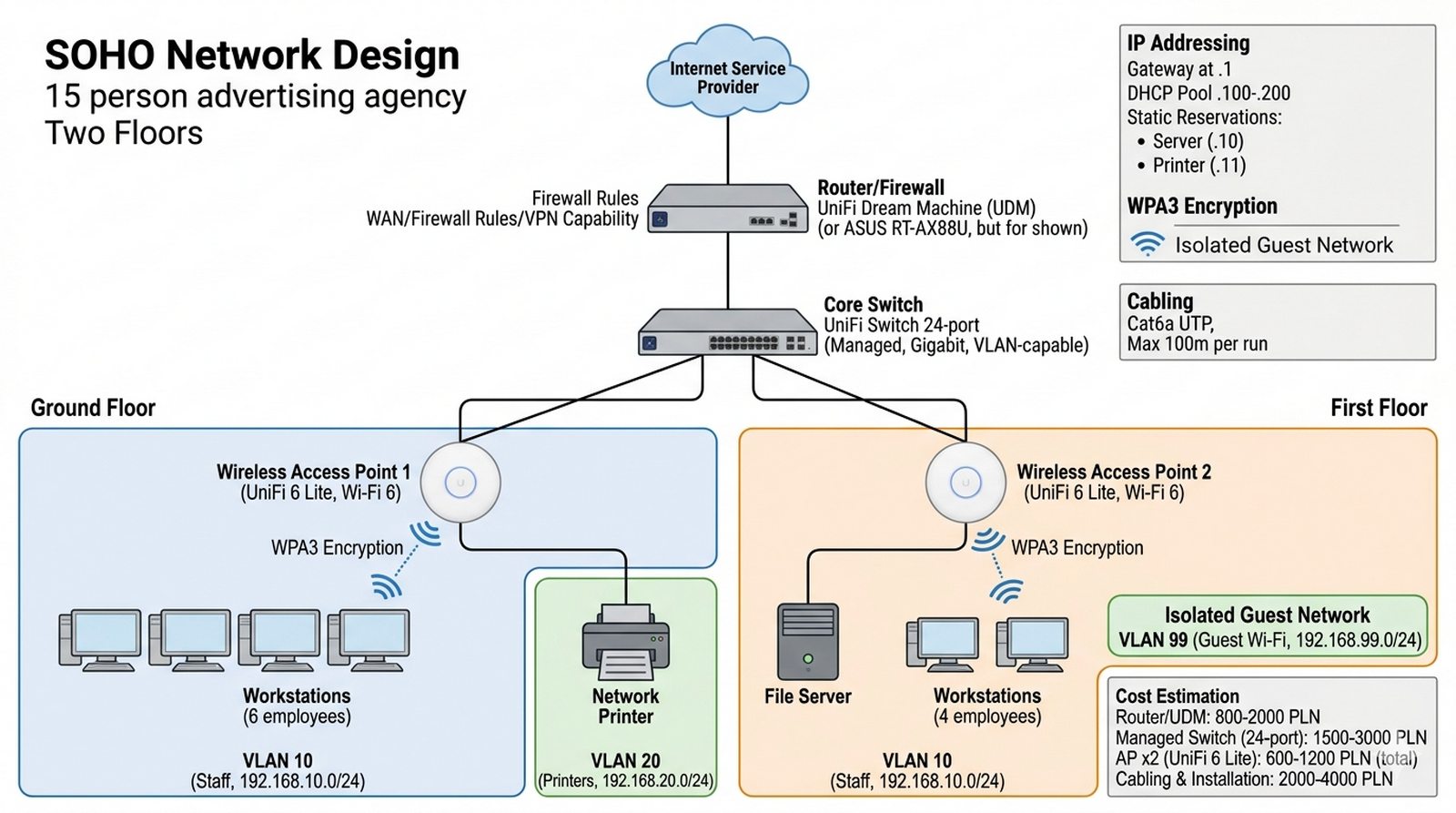 Twoim klientem jest mała agencja reklamowa z 15 pracownikami (graficy, copywriterzy, account managerowie). Firma aktualnie funkcjonuje na "zwykłym" routerze od ISP i jednej drukarce podłączonej przez USB do jednego komputera. Właściciel chce unowocześnić infrastrukturę: potrzebują stabilnego internetu dla 10 stanowisk, dostępu do wspólnej drukarki sieciowej (dwa oddziały: na parterze i piętrze), serwera plików (współpraca nad projektami), oraz osobnego Wi-Fi dla gości (klienci przychodzą na spotkania). Budżet jest ograniczony. Przygotuj profesjonalny "list do klienta" w formie referatu, w którym opiszesz proponowaną architekturę sieci (topologia, urządzenia, okablowanie), uzasadnisz dobór urządzeń (router, switch, punkt dostępowy), zaprojektujesz segmentację z VLAN (VLAN dla pracowników, VLAN dla gości), zaproponujesz plan adresacji IPv4, oraz oszacujesz przybliżone koszty. Referat ma być zrozumiały dla właściciela (laika), ale merytoryczny.