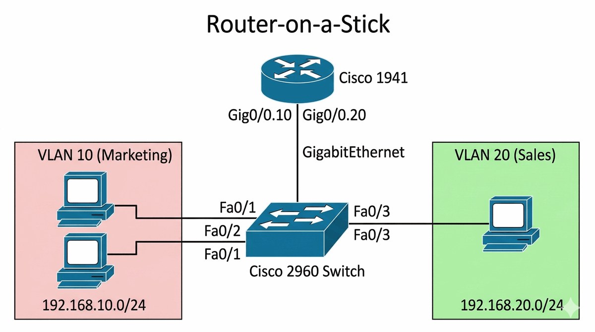 Głównym celem projektu jest zaprojektowanie i wdrożenie logicznej segmentacji sieci LAN przy wykorzystaniu technologii VLAN (Virtual Local Area Network). Studenci poznają zasady działania sieci VLAN, mechanizm tagowania ramek 802.1Q oraz metodę routingu między VLANami znaną jako Router-on-a-Stick.