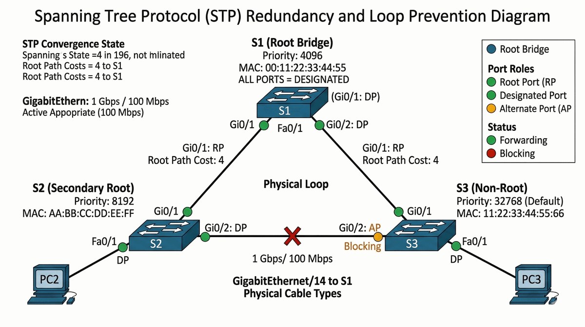 Głównym celem projektu jest zapewnienie nadmiarowości w sieci LAN poprzez eliminację pętli warstwy 2 przy jednoczesnym zachowaniu fizycznych tras zapasowych. Studenci poznają zasady działania protokołu STP, mechanizm wyboru Root Bridge, role portów (Root, Designated, Alternate) oraz stany portów (Forwarding, Blocking).
