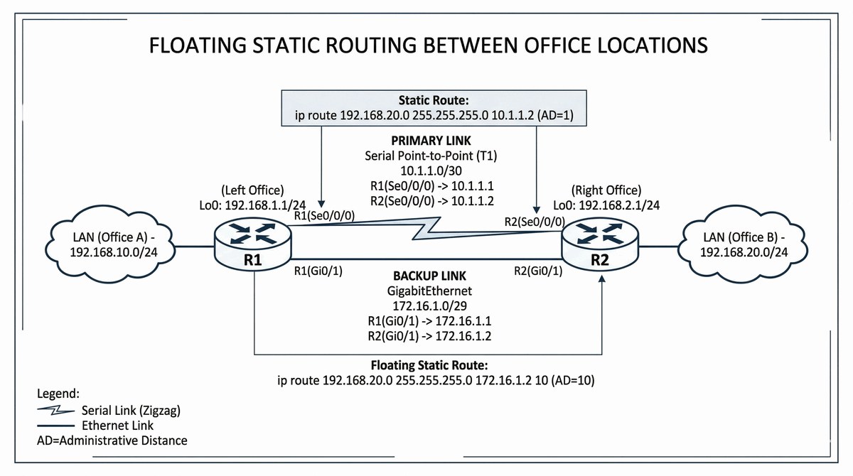 W ramach projektu należy skonfigurować dwa niezależne łącza między ruterami (Serial oraz GigabitEthernet), skonfigurować trasę główną z niższym dystansem administracyjnym oraz trasę zapasową z wyższym AD. Projekt obejmuje przeprowadzenie testów symulacji awarii poprzez wyłączenie interfejsu oraz weryfikację automatycznej zmiany ścieżki w tablicy routingu.