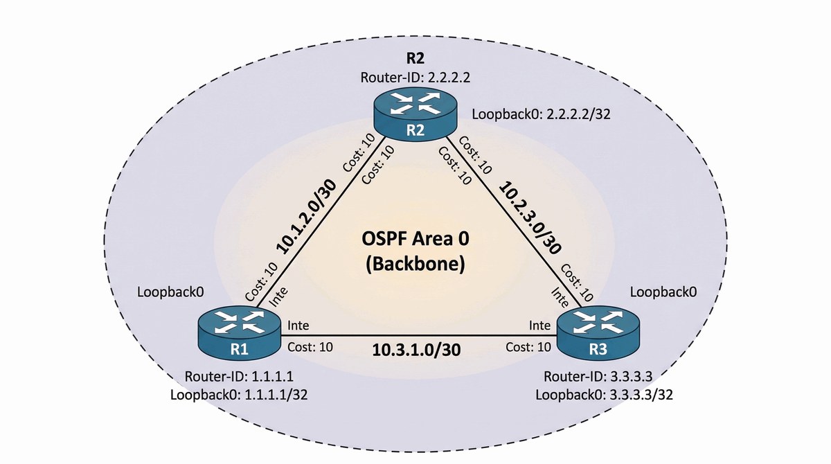 Projekt obejmuje konfigurację trzech ruterów w pętlę, konfigurację procesu OSPF z unikalnymi router-id, weryfikację nawiązania relacji sąsiedztwa oraz analizę rekonwergencji sieci w przypadku awarii jednego z łączy. Studenci sprawdzą tablice routingu i bazy danych link-state.