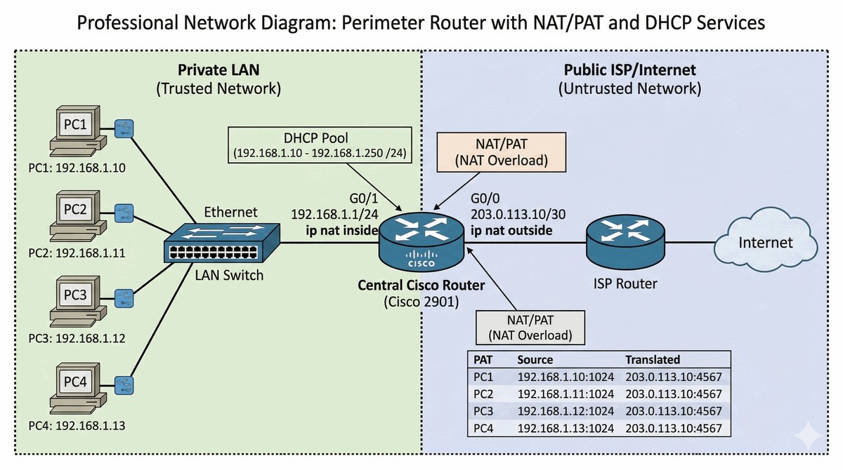 Celem projektu jest zautomatyzowanie przyznawania adresów IP w sieci wewnętrznej poprzez konfigurację serwera DHCP (Dynamic Host Configuration Protocol) na ruterze brzegowym. Studenci poznają proces DORA (Discover, Offer, Request, Acknowledge) oraz zasady konfiguracji pul adresów z wykluczeniami dla urządzeń statycznych.