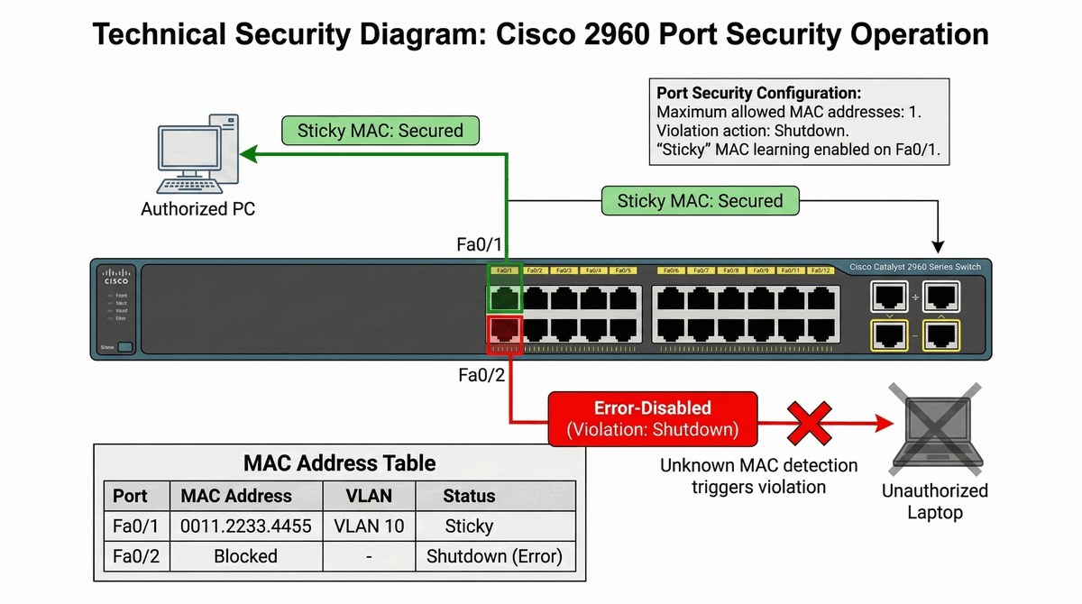 Celem projektu jest zabezpieczenie dostępu do sieci lokalnej poprzez autoryzację urządzeń na podstawie ich adresów MAC (Media Access Control) bezpośrednio na portach przełącznika. Studenci poznają zasady działania funkcji Port Security oraz różne tryby naruszenia (violation modes): protect, restrict i shutdown.