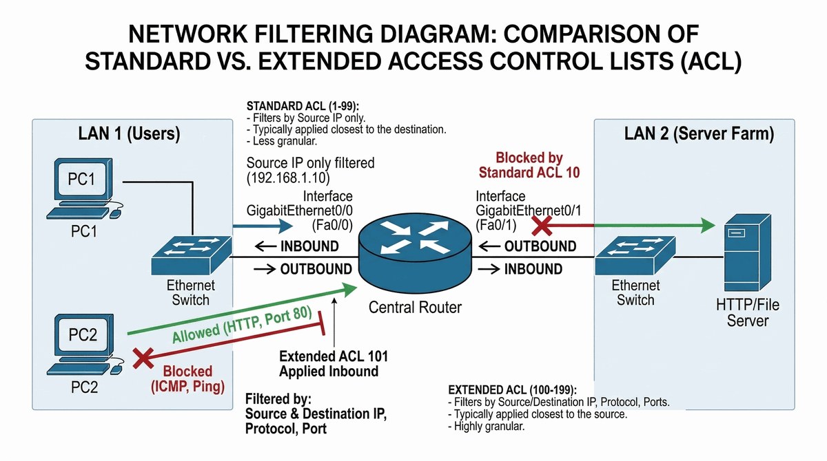 Celem projektu jest zapewnienie bezpieczeństwa zasobów serwerowych poprzez granularne filtrowanie ruchu IP w zależności od protokołu warstwy 3 i numeru portu warstwy 4. Studenci poznają zasady działania list ACL (Access Control Lists), zarówno standardowych jak i rozszerzonych, oraz różnice w ich zastosowaniu.