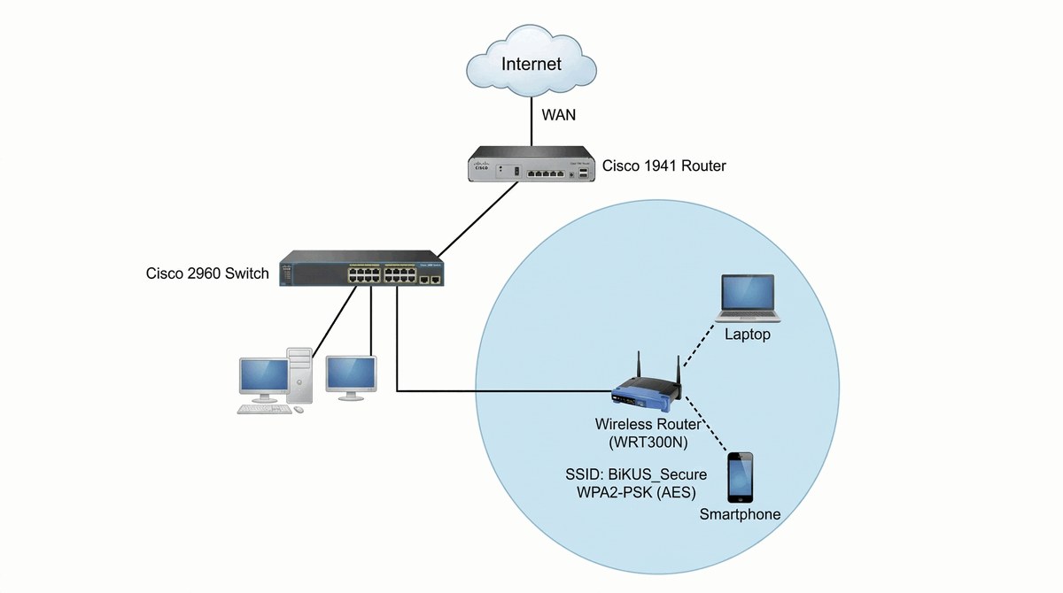 Projekt obejmuje konfigurację rutera bezprzewodowego z SSID, zabezpieczeń WPA2-PSK z algorytmem AES, puli DHCP dla klientów bezprzewodowych oraz integrację z siecią przewodową. Studenci nauczą się konfigurować urządzenia mobilne (laptopy, smartfony) do pracy w sieci WLAN oraz weryfikować łączność między segmentem przewodowym i bezprzewodowym.