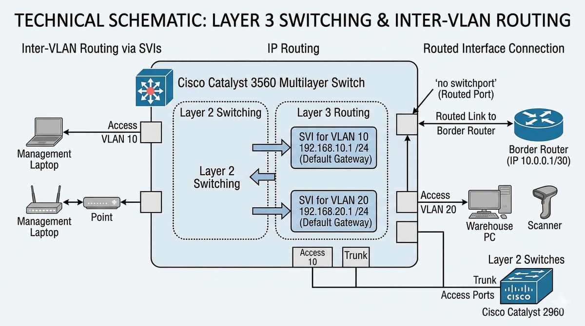 Celem projektu jest zastosowanie nowoczesnych metod routingu wewnątrz sieci kampusowej poprzez przeniesienie funkcji routingu z tradycyjnego rutera na przełącznik wielowarstwowy (L3 Switch). Studenci poznają zasady działania interfejsów SVI (Switch Virtual Interface), konfiguracji portów warstwy 3 oraz routingu sprzętowego realizowanego przez ASIC.