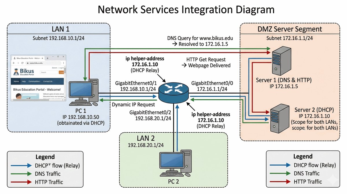 Celem projektu jest złożona konfiguracja środowiska serwerowego udostępniającego kluczowe usługi sieciowe dla użytkowników końcowych. Studenci poznają interakcję między usługami DHCP, DNS i HTTP oraz zasady działania mechanizmu DHCP Relay (ip helper-address) umożliwiającego rozsiewanie DHCP przez router.