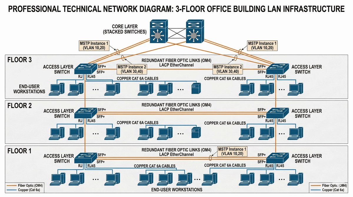 Celem projektu jest zaprojektowanie i wdrożenie redundantnej infrastruktury okablowania strukturalnego oraz przełączania warstwy 2 (L2) zgodnej ze standardami TIA-568 oraz IEEE. Projekt obejmuje fizyczne okablowanie pionowe (vertical cabling) między pomieszczeniami MDF a IDF oraz okablowanie poziome (horizontal cabling) do punktów abonenckich, z wykorzystaniem kabli miedziowych kategorii 6a (Cat6a) lub wyższej oraz kabli światłowodowych wielomodowych OM3/OM4 dla łączy między przełącznikami. Kluczowym elementem jest implementacja protokołu MSTP (Multiple Spanning Tree Protocol) z redundantnymi przełącznikami zapewniającymi ciągłość działania w przypadku awarii jednego urządzenia lub łącza. Projekt wymaga konfiguracji EtherChannel (LACP) dla agregacji łączy między przełącznikami, VLAN dla segmentacji ruchu, oraz PortFast i BPDU Guard na portach dostępowych dla szybszej konwergencji.