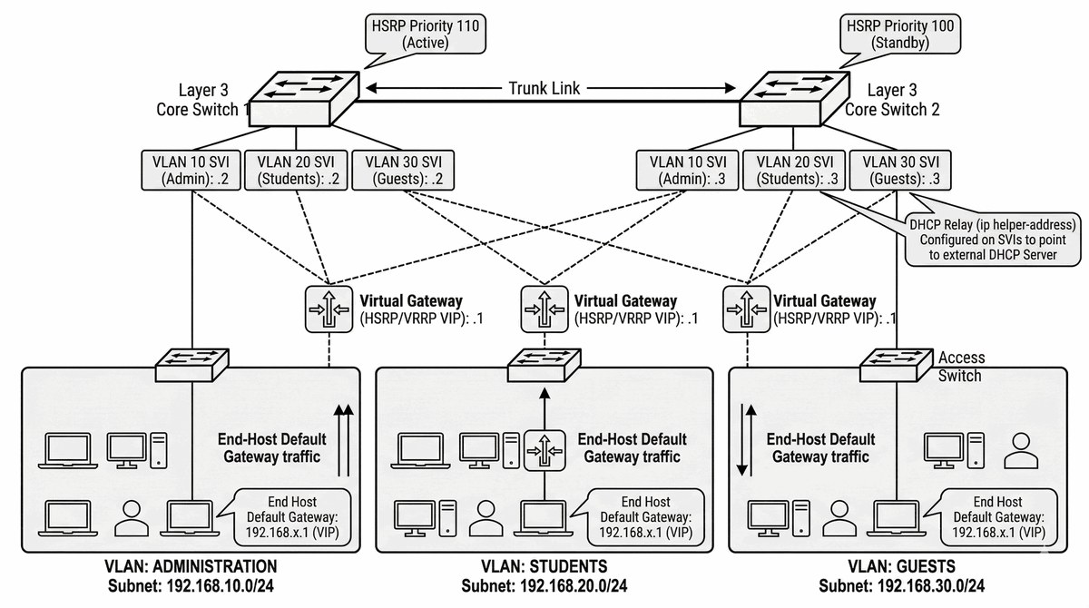 W budynku firmowym znajdują się trzy oddziały (Administracja, Studenci, Goście) rozmieszczone na osobnych piętrch, z których każdy pracuje w wydzielonej sieci VLAN (odpowiednio VLAN 10, 20, 30) z oddzielną pulą adresów IP. Komputery stacjonarne i urządzenia mobilne muszą mieć zapewnioną łączność między sobą poprzez routing realizowany przez przełączniki warstwy 3 (L3 Core Switches) z wykorzystaniem interfejsów SVI (Switch Virtual Interface). Awaria pojedynczego urządzenia routującego skutkowałaby utratą łączności dla setek użytkowników, dlatego konieczne jest wdrożenie mechanizmu redundancji bramy domyślnej FHRP - protokołu HSRPv2 (Hot Standby Router Protocol) lub VRRP (Virtual Router Redundancy Protocol), które tworzą wirtualny adres IP (VIP, np. .1 w każdej podsieci) jako wspólną bramę dla wszystkich hostów. Przełączniki L3 muszą być skonfigurowane jako Active/Standby z odpowiednimi priorytetami (np. 110/100), funkcją preempt umożliwiającą powrót do pierwotnego urządzenia po awarii, oraz mechanizmem trackowania łączy uplink, który automatycznie obniży priorytet w przypadku utraty łączności w kierunku Internetu lub sieci backbone. Adresacja IP dla stacji roboczych ma być realizowana przez centralny serwer DHCP, a przełączniki L3 pełnią rolę DHCP Relay (ip helper-address) przekazującego żądania do serwera. Czas przełączenia (failover) przy poprawnej konfiguracji timerów (HSRP hello 3s, hold 10s) wynosi około 3-5 sekund, co jest akceptowalne dla większości zastosowań biurowych, ale wymaga weryfikacji podczas testów obciążeniowych.