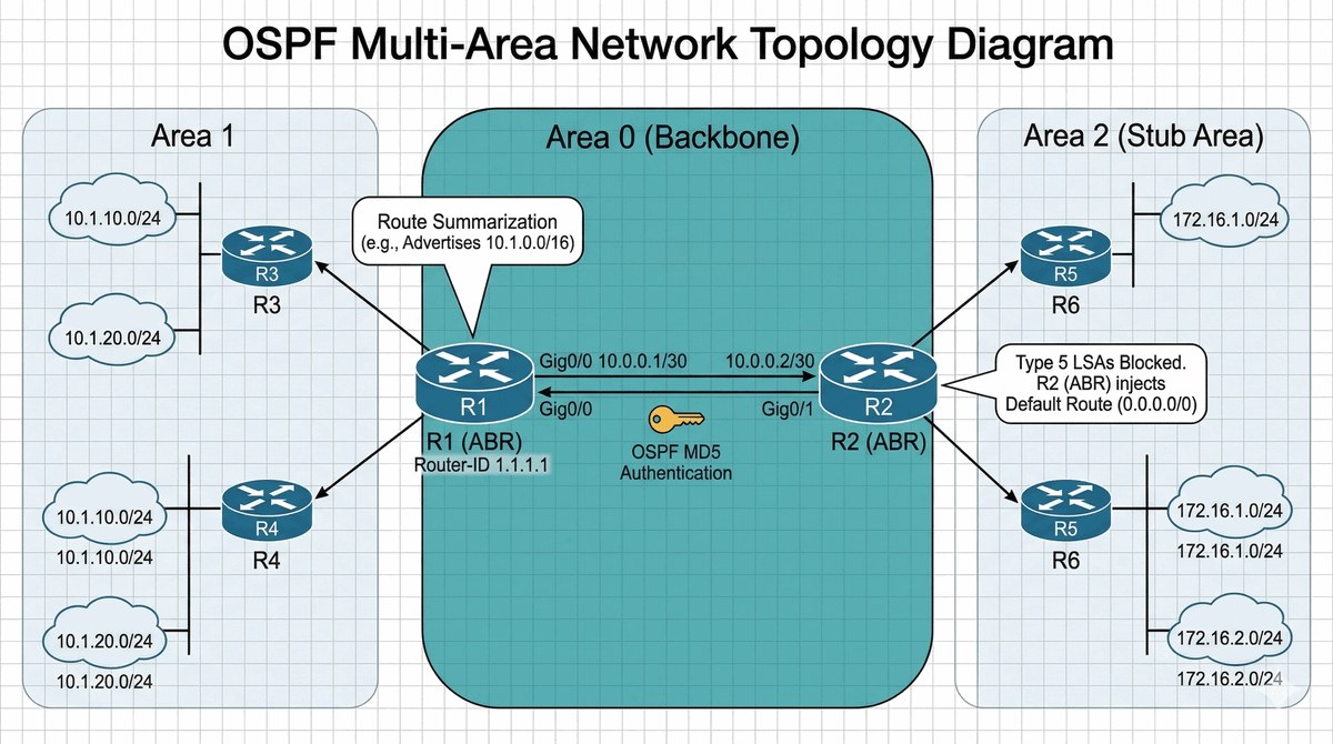 Celem projektu jest zaprojektowanie i weryfikacja wieloobszarowej domeny OSPF (Open Shortest Path First) w celu optymalizacji tablic routingu i ograniczenia propagacji zmian w dużych sieciach korporacyjnych. Projekt obejmuje konfigurację hierarchicznej struktury obszarów z wykorzystaniem Area 0 (Backbone) jako centralnego punktu łączącego obszary brzegowe (Area 1, 2, itd.) poprzez rutery ABR (Area Border Router). Kluczowym elementem jest zastosowanie sumaryzacji tras (area range) na ruterach ABR w celu redukcji rozmiaru bazy danych LSDB (Link State Database) i minimalizacji propagacji LSA Type 3 między obszarami. Projekt wymaga również rozważenia zastosowania obszarów typu Stub lub Totally Stubby dla oddziałów bezpośrednio podłączonych do ABR, co eliminuje LSA Type 5 (external routes) z tablic rutera oddziałowego, lub NSSA (Not-So-Stubby Area) gdy wymagana jest redystrybucja tras z innych protokołów. Wymagana jest autentykacja OSPF (MD5 lub HMAC-SHA) na wszystkich łączy międzyruterowych oraz monitorowanie LSDB i procesu SPF dla weryfikacji poprawnej konwergencji - czas zbiegania wynosi standardowo około 5-40 sekund w zależności od wielkości obszaru i timerów SPF.