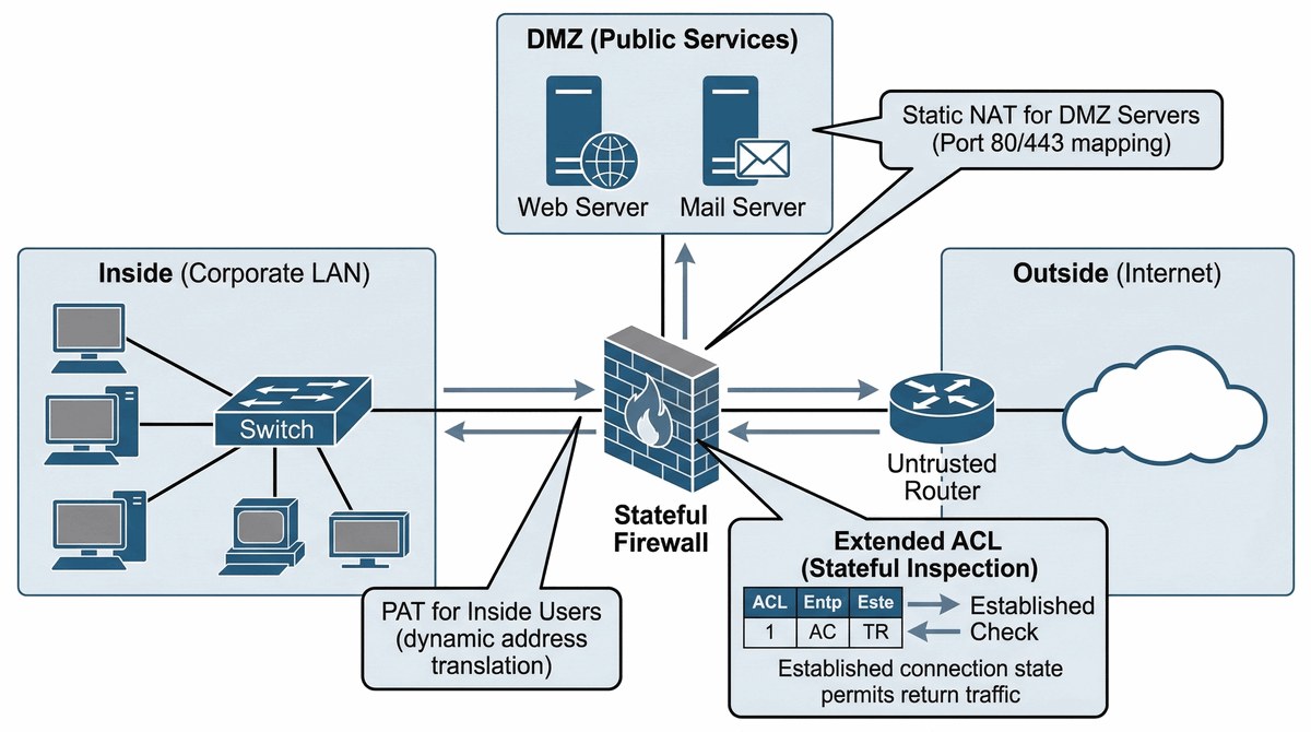 Celem projektu jest zabezpieczenie styku sieci lokalnej z Internetem oraz wystawienie usług publicznych (WWW, DNS, Mail) w odseparowanej strefie DMZ (Demilitarized Zone) zgodnie z zasadą defense-in-depth i modelem bezpieczeństwa strefowego. Projekt obejmuje wdrożenie dwuzaporowej architektury (dual-firewall) z trzema strefami bezpieczeństwa: Inside (sieć wewnętrzna, zaufana), Outside (Internet, niezaufana) i DMZ (strefa pośrednia dla usług publicznych). W strefie Inside stosowany jest NAT z przeciążeniem (PAT/overload) dla translacji adresów prywatnych na publiczne (Dynamic PAT), natomiast dla usług w DMZ wymagany jest NAT statyczny (Static NAT lub Destination NAT) mapujący publiczne adresy IP na wewnętrzne serwery. Kluczowym elementem jest implementacja stanowej inspekcji pakietów (Stateful Packet Inspection) oraz rozszerzonych list ACL (Extended ACL) z zasadą domyślnego blokowania (Deny All Incoming) na interfejsie Outside. Projekt wymaga również zabezpieczenia przed atakami DoS (limity połączeń, tcp-intercept), implementacji inspekcji protokołów aplikacyjnych (ALG) dla FTP, SIP, H.323 oraz logowania zdarzeń do zewnętrznego serwera Syslog dla compliance i forensyki bezpieczeństwa.