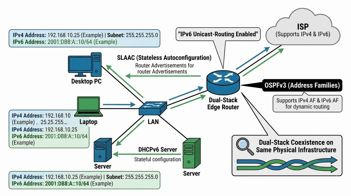 Celem projektu jest przygotowanie infrastruktury sieciowej do obsługi protokołu IPv6 bez przerywania świadczenia usług w standardzie IPv4, realizując model Dual-Stack (obsługa obu stosów protokołów jednocześnie). Projekt obejmuje zaplanowanie schematu adresacji IPv6 z wykorzystaniem prefiksu GUA (Global Unicast Address) otrzymanego od ISP (np. /48) oraz podział na podsieci /64 dla segmentów LAN (zgodnie z RFC 5375 - minimalna wielkość podsieci IPv6 to /64 dla obsługi SLAAC i ND). Kluczowym elementem jest wdrożenie mechanizmów autokonfiguracji: bezstanowej (SLAAC - Stateless Address Autoconfiguration) dla auto-przydzielania adresów z prefixu + EUI-64 lub losowych (RFC 4941), lub stanowej usługi DHCPv6 dla pełnej kontroli adresacji i dodatkowych opcji (DNS, NTP). Routing IPv6 realizowany jest przez OSPFv3 (Open Shortest Path First version 3) z wykorzystaniem 32-bitowych Router ID w formacie IPv4, działającym niezależnie od routingu IPv4. Projekt wymaga również implementacji zabezpieczeń specyficznych dla IPv6: RA Guard przed atakami Router Advertisement Spoofing, ND (Neighbor Discovery) Inspection, DHCPv6 Guard oraz IPv6 ACL dla ochrony interfejsów VTY i interfejsów zarządzania.