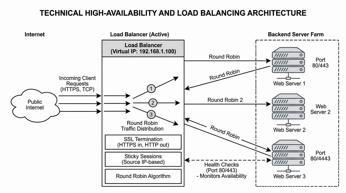 Celem projektu jest skalowanie usług sieciowych i zapewnienie ich wysokiej dostępności poprzez rozkładanie ruchu (load balancing) na wiele serwerów fizycznych lub wirtualnych w farmie backend. Projekt obejmuje konfigurację urządzenia lub oprogramowania Load Balancer (L4/L7) takiego jak F5 BIG-IP, HAProxy, Nginx, Citrix NetScaler lub funkcje LB w MikroTik/router. Kluczowym elementem jest implementacja algorytmów rozkładu ruchu: Round Robin (równy podział), Least Connections (najmniej połączeń), IP Hash (klient na ten sam serwer), Weighted Round Robin (z wagami) lub innych w zależności od charakterystyki ruchu. Wymagana jest konfiguracja Health Check (sprawdzanie zdrowia) dla każdego serwera backend - najczęściej przez periodyczne odpytywanie portu TCP (np. 80/443) lub wysyłanie żądań HTTP GET z weryfikacją kodu odpowiedzi, z parametrami Fall (ile niepowodzeń przed wyłączeniem) i Rise (ile sukcesów przed ponownym włączeniem). Projekt wymaga również implementacji Session Persistence (Sticky Sessions) bazującej na źródłowym adresie IP lub cookie HTTP dla utrzymania sesji użytkownika na tym samym serwerze, SSL Termination (rozszyfrowanie SSL na LB dla oszczędności zasobów serwerów backend) oraz fail-over między wieloma urządzeniami LB w konfiguracji Active-Standby dla zapewnienia ciągłości przy awarii samego LB.