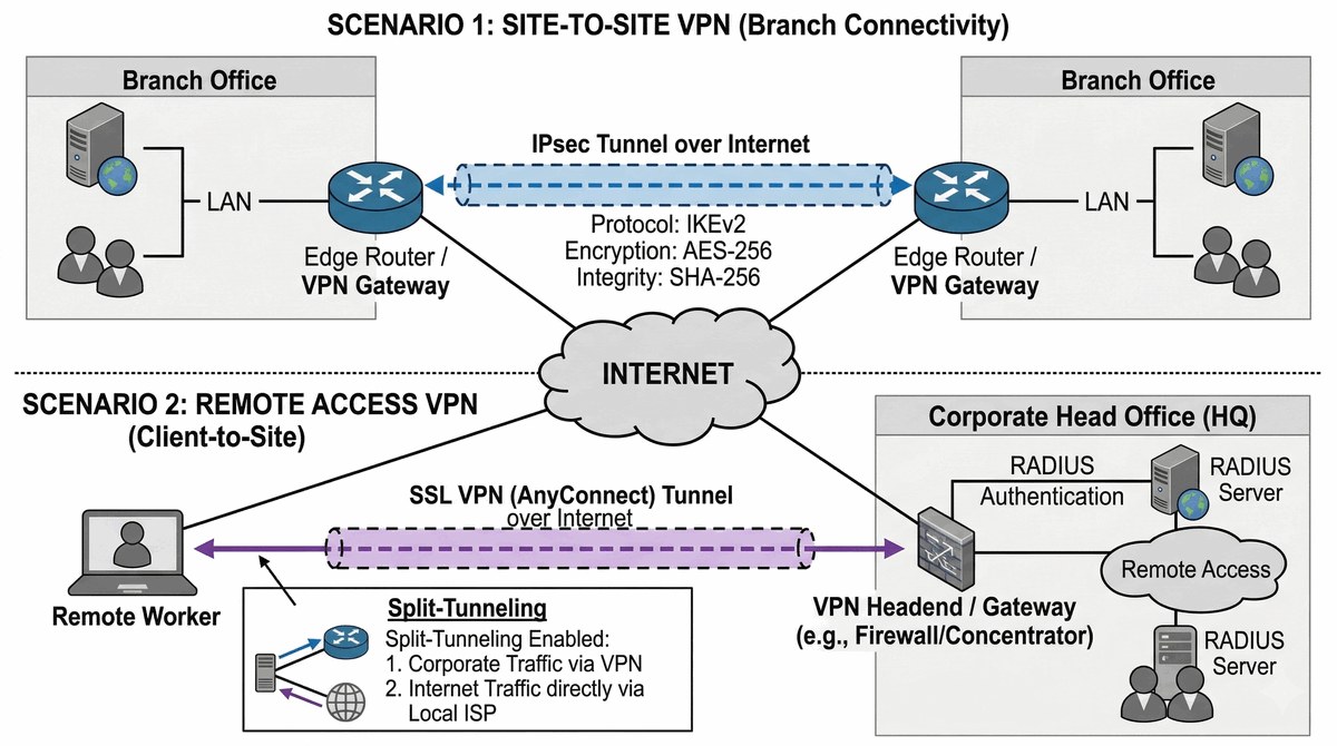 Celem projektu jest zapewnienie bezpiecznej komunikacji między oddziałami firmy (Site-to-Site) poprzez szyfrowane tunele VPN oraz umożliwienie zdalnego dostępu (Remote Access VPN) dla pracowników pracujących poza biurem. Projekt obejmuje konfigurację tuneli IPsec w trybie IKEv2 (zalecany w 2025/2026, oferuje lepszą odporność na ataki i szybszą negocjację niż IKEv1) z wykorzystaniem algorytmów kryptograficznych: AES-GCM-256 do szyfrowania, ECDH groups 19/20/21 dla wymiany kluczy (zamiast przestarzałego DH group 14/5), SHA-256 lub SHA-3 dla integralności. Kluczowym elementem jest implementacja Site-to-Site VPN w modelu policy-based (Crypto ACL) lub route-based (VTI - Virtual Tunnel Interface) w zależności od skali - mniejsze wdrożenia = policy-based, większe lub z routingiem dynamicznym = route-based. Dla Remote Access VPN wymagana jest konfiguracja SSL VPN (Cisco AnyConnect/OpenConnect lub inny klient) lub IPsec IKEv2 z odpowiednim profilem połączenia, pulą adresów IP oraz autentykacji (lokalna baza użytkowników lub RADIUS). Projekt wymaga również zarządzania certyfikatami lub PSK (Pre-Shared Key), konfiguracji transform set/proposal (ESP-AES-256-GCM, ESP-SHA256-HMAC), NAT-Traversal dla obsługi za NAT oraz testowania łączności i failover w przypadku utraty tunelu.