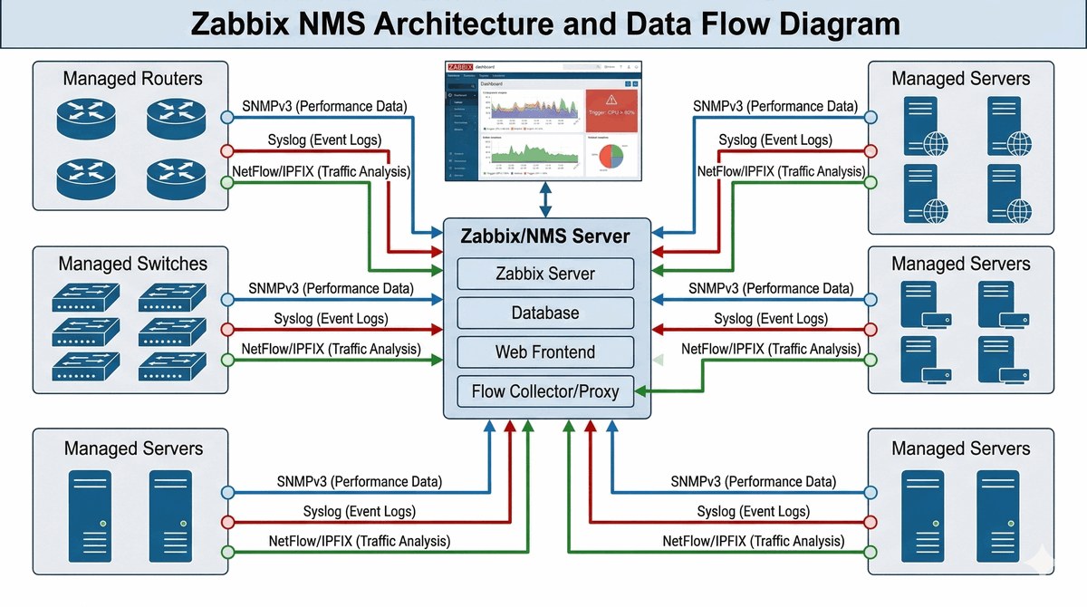 Administratorzy sieci otrzymują telefoniczne zgłoszenia od użytkowników o "wolnej sieci" w godzinach popołudniowych (14:00-18:00), ale nie mają żadnych obiektywnych danych potwierdzających przyczynę - nie wiedzą, który segment sieci jest przeciążony, które aplikacje generują największy ruch, ani kiedy dokładnie problem się pojawia. Dodatkowo, awaria przełącznika dostępowego na drugim piętrze została wykryta dopiero po 3 godzinach, ponieważ nikt nie był fizycznie obecny w budynku, a stacje robocze automatycznie przeszły na zapasowy WLAN bez powiadomienia NOC. Konieczne jest wdrożenie kompletnego systemu monitorowania sieci opartego na trzech filarach: protokole SNMP (Simple Network Management Protocol) w wersji 3 (z autentykacją SHA i szyfrowaniem AES-256) zbierającym metryki z wszystkich urządzeń sieciowych (wykorzystanie CPU, pamięci, portów Gigabit - IF-MIB, CPU-MIB, entPhysicalEntry) do platformy NMS (Zabbix, PRTG, LibreNMS) w interwale co 1-5 minut z dashboardami pokazującymi status w czasie rzeczywistym; protokole Syslog направляjącym logi z urządzeń (autentykacja, ACL denied, link Up/Down, błędy interfejsów) do centralnego serwera (rsyslog, Graylog) z klasyfikacją severity (0-Emergency do 6-Debug) i możliwością wyszukiwania pełnotekstowego; protokole NetFlow/IPFIX lub sFlow analizującym przepływy ruchu (source IP, destination IP, port, bytes, packets) w celu identyfikacji Top Talkers (kto generuje najwięcej ruchu) i Top Applications (które usługi/porty dominują). Konfiguracja progów alertowych (thresholds) musi generować powiadomienia (e-mail, SMS, webhook do Slack) gdy wykorzystanie CPU przekracza 80%, pamięć >85%, interfejs >90% przepustowości, lub gdy nastąpi zdarzenie linkDown. SNMP Traps zapewniają asynchroniczne powiadomienia o awariach (coldStart, warmStart, linkDown, linkUp). Dokumentacja projektu musi zawierać screenshoty dashboardów, wyniki analizy przepływów NetFlow w godzinach szczytu wskazujące źródło problemu oraz raport zdarzeń krytycznych za minimum 7 dni.