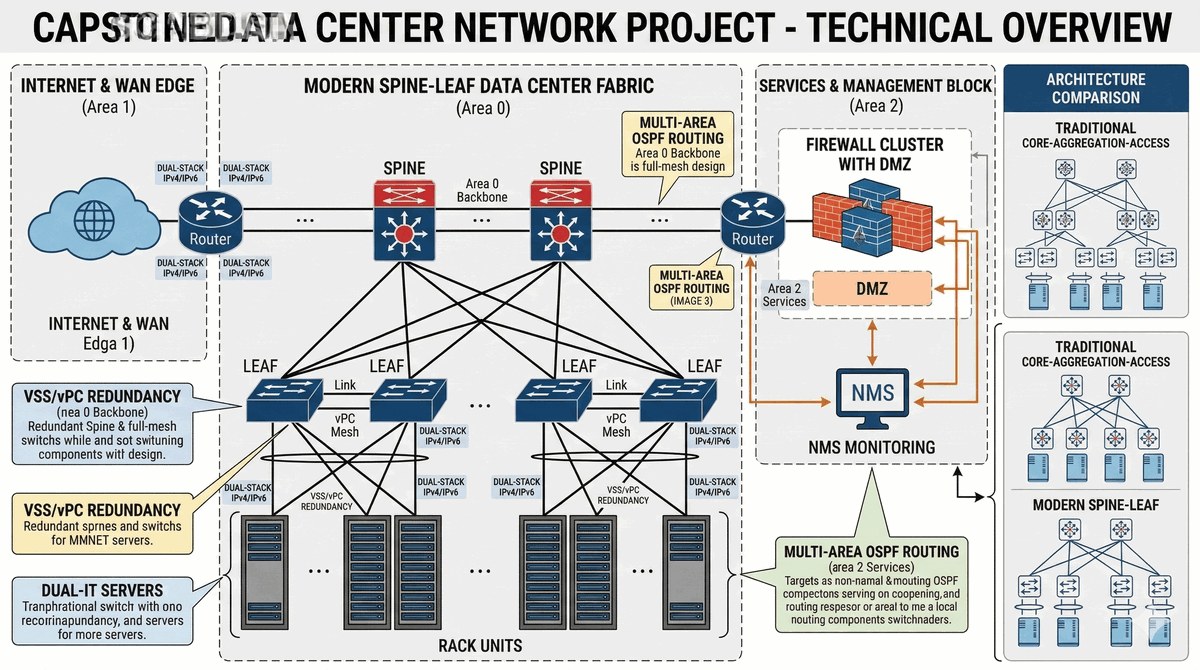 Celem projektu jest stworzenie kompleksowego projektu sieciowego nowoczesnego Data Center łączącego wszystkie aspekty kursu: od fizycznego medium transmisyjnego, przez wysokodostępny szkielet (fabric) warstwy 2 i 3, po bezpieczeństwo i usługi wyższych warstw - zadanie integrujące (Capstone). Projekt obejmuje zaprojektowanie topologii Spine-Leaf (obecnie standard przemysłowy zastępujący przestarzały trójwarstwowy model Core-Distribution-Access) z wykorzystaniem przełączników ToR (Top-of-Rack) jako Leaf i switchy centralne jako Spine, połączonych redundantnymi łączami 100G/200G/400G z oversubscription ratio dopasowanym do klasy obciążenia (np. 3:1 dla typowych obciążeń, 1.5:1 dla AI/ML). Kluczowym elementem jest implementacja VXLAN (Virtual Extensible LAN) z EVPN jako kontrolą warstwy overlay dla skalowalności (obsługa tysięcy VLAN w multi-tenant) lub tradycyjnego L2 z MSTP i L3 z OSPF/ECMP. Wymagany jest redundantny szkielet L2 z EtherChannel (LACP) dla trunków między Leaf, routing L3 z OSPF lub BGP dla łączności między podsieciami, brzeg sieci z NAT/PAT, ACL i opcjonalnym firewallem, obsługa Dual-Stack IPv4/IPv6 oraz integracja systemu monitorowania (SNMP/Syslog/NetFlow). Projekt wymaga również dokumentacji schematu fizycznego i logicznego, tabeli adresacji, specyfikacji sprzętowej z redundantnym zasilaniem i chłodzeniem, oraz analizy przepustowości uplinków z uwzględnieniem congestion i fail-over.