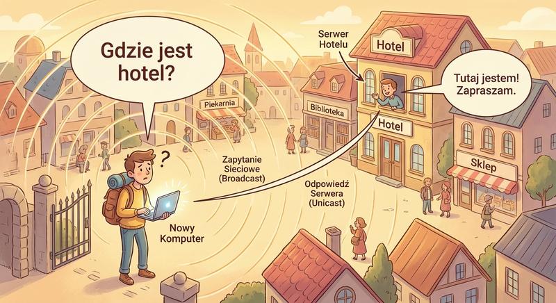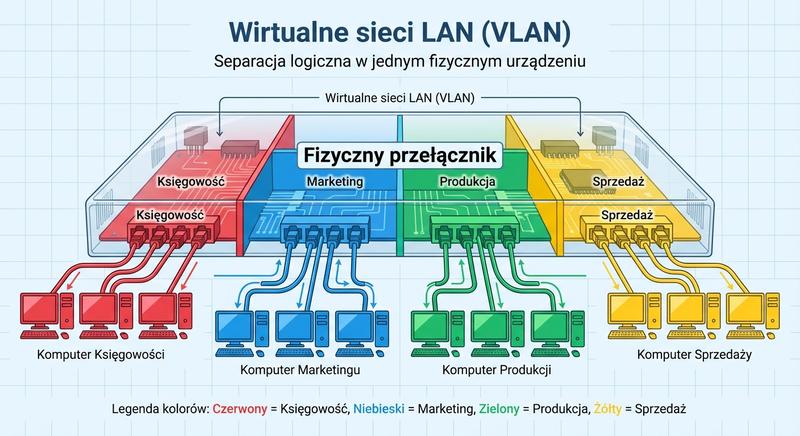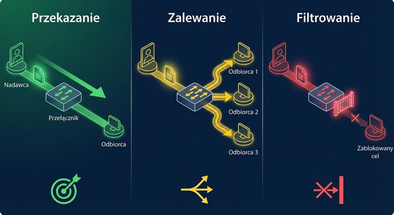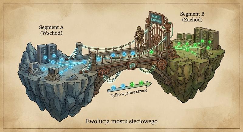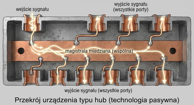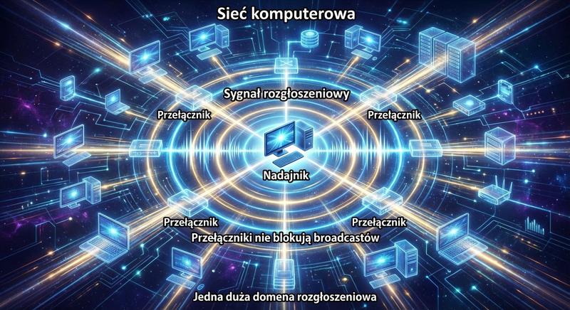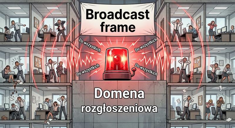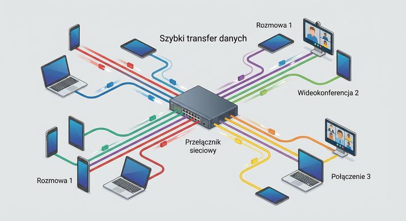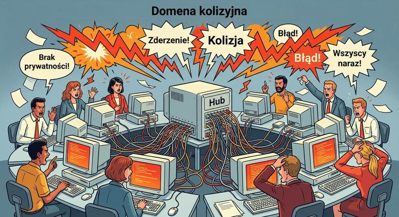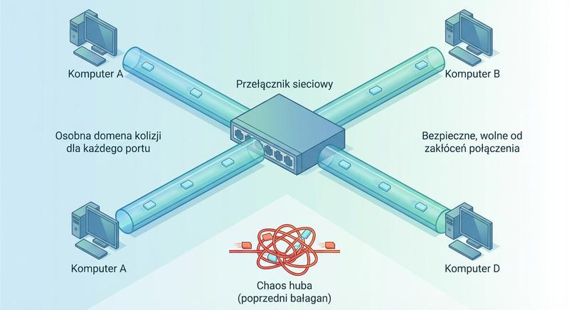 Przypomnijmy sobie największy problem urządzeń Warstwy 1, takich jak huby. Tworzyły one jedną, wielką domenę kolizyjną. Każda transmisja była rozsyłana do wszystkich, a w danym momencie mogło nadawać tylko jedno urządzenie. Prowadziło to do masowych kolizji, drastycznego spadku wydajności i braku bezpieczeństwa. Sieć przypominała jeden wielki, głośny pokój, w którym wszyscy próbowali mówić naraz. Potrzebny był mechanizm, który podzieliłby ten pokój na mniejsze, wyciszone kabiny, w których mogłyby odbywać się prywatne rozmowy.